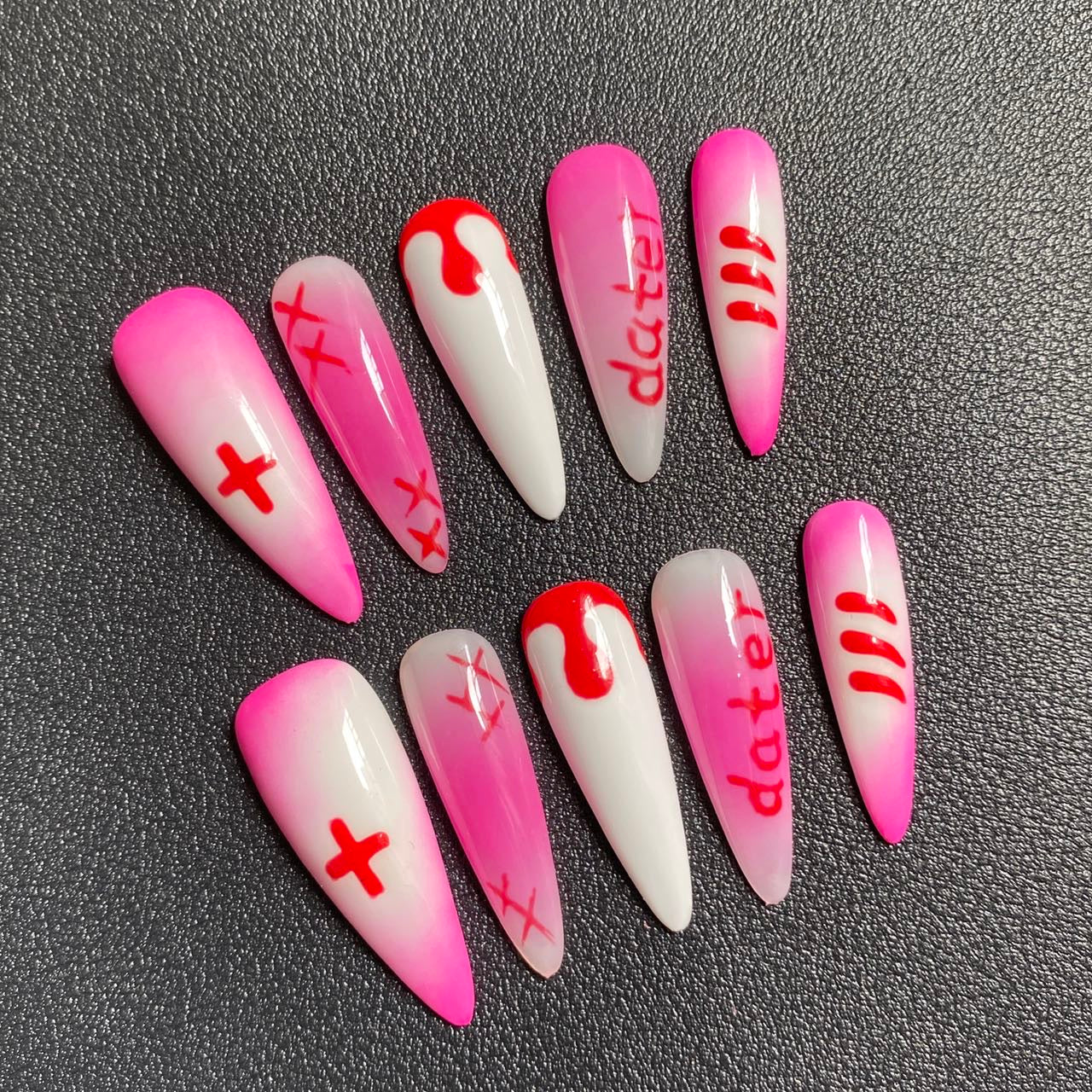Break hearts and rules with our Date Night Chaos – where bubblegum pink meets blood-drip red in the most iconic way. Featuring handwritten “dater” text, Xs, + signs, and edgy 3-stripe accents, this set brings Y2K rebellion and Valentine’s energy with a dark twist.