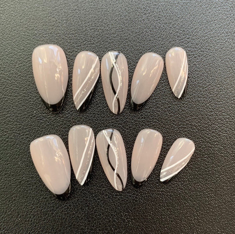 A luxe fusion of minimalism and motion — Silken Lines features a cool taupe base with glossy black tips and flowing linework in white and silver. It's elegance in motion, made for the modern muse.