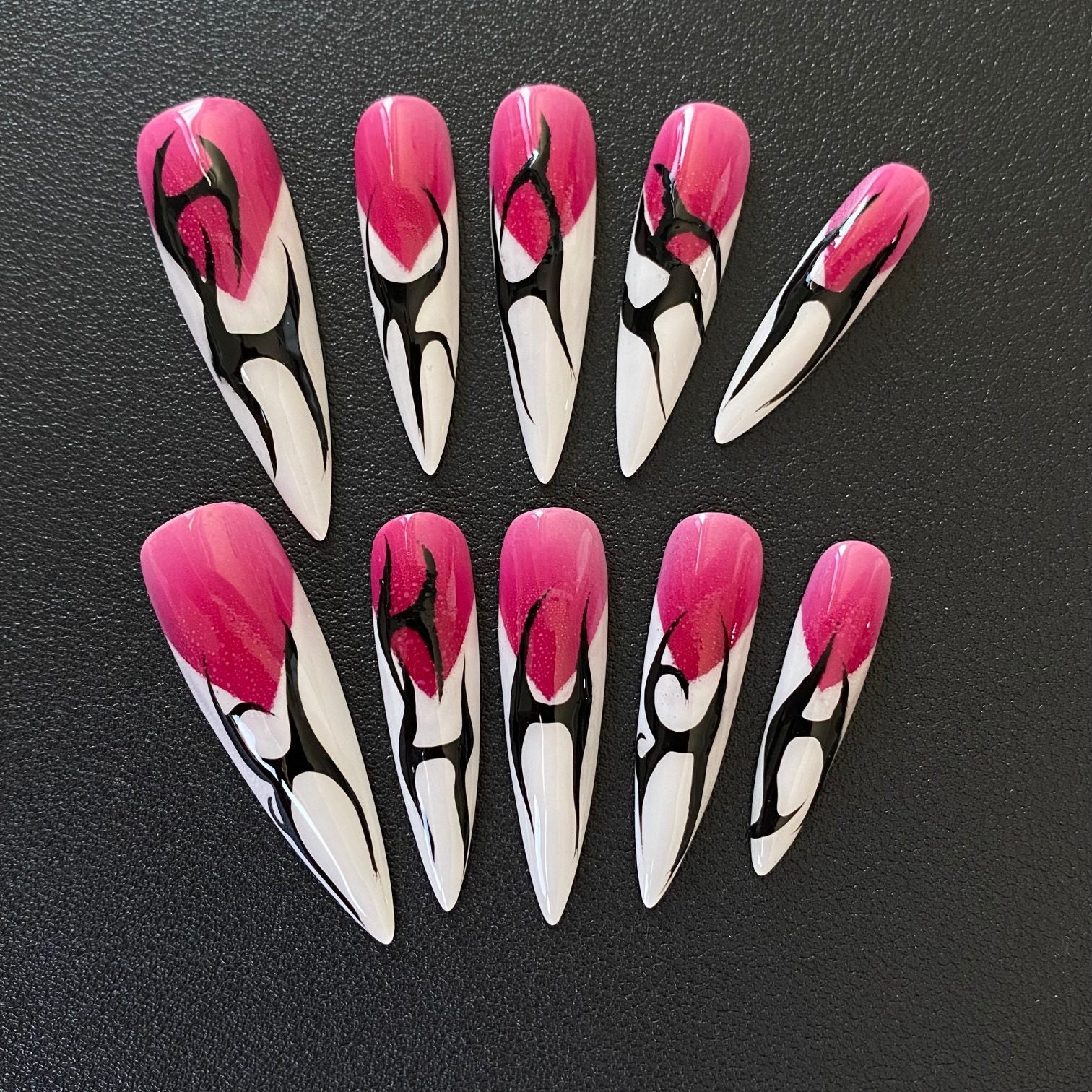 Strike bold and unapologetic with Venom Kiss, a sharp and stylish press-on nail set that fuses passion and power. Featuring dramatic black and white abstract flames against a hot pink backdrop, this look is made to slay.
